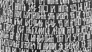 Fragment van de Zwarte Steen (Doffiy Kolini). Op de tweede regel staat de inscriptie: (...) "ef monta tjel sompe ef monta ups lek eft" (...) - "dezelfde straf volgt uit dezelfde daad ofwel een ...". Dit is dus het begin van de eerste Mennmarât. | ||