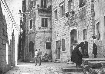 De Ðuvelme-straat in Gÿrô: een van de vele schilderachtige straatjes in het oude centrum. Plaveisel en gevels bestaan voornamelijk uit grijze flâkâ-steen. Vrouwen in klederdracht doen nog hun was bij de openbare pomp. Hoewel de dichte vensters anders doen vermoeden, herbergt het pand achter de pomp het bekendste hotel/café van de stad. Boven de monumentale deur lezen we Hotela - Câðy (câðy is het Pegrevische woord voor "bar"). | ||