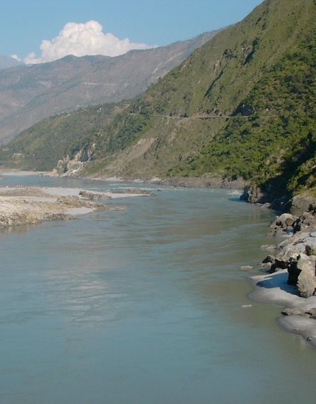 De Firani baant zich een weg door een woest gebergte. De foto toont de zuidpunt van het Firani-meer, het verbrede deel van de rivier dat als stuwmeer fungeert. Tegen de berghelling is de smalle lijn van weg 45 te onderscheiden. | ||