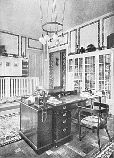 De werkkamer van koning Huron II in het Fordo-seert te Hirdo. De foto is omstreeks 1915 genomen, dus vlak na de modernisering van een aantal vertrekken. In 1960 is deze kamer weer in de oorspronkelijke 18e-eeuwse stijl teruggebracht, iets waar men in 2000 weer spijt van heeft. | ||