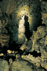 De Hoegtô-grot is niet uitzonderlijk imponerend, maar geeft wel aanleiding tot een rijke verbeelding en talloze verhalen en anekdotes. De lokale bevolking ziet graag alle mogelijke wezens en geesten in de grillig gevormde rotspartijen, en hieraan worden spannende verhalen gekoppeld. Tegenwoordig zijn zulke "taferelen" ook veelvuldig gefotografeerd, waarbij de suggestieve belichting natuurlijk vele schaduwwerkingen - en dus interpretaties - mogelijk maakt. Deze foto is heel bekend omdat hij een gebeurtenis uit de Sage van de Mislukte Weddenschap weergeeft, namelijk de verslinding van Ricoh door het Proeft-monster. Hoe moeten we de foto interpreteren? Linksonder zien we Ricoh op zijn rug liggen: hij is naakt, en we zien zijn dijbenen, met daartussen zijn penis. Rechtsonder zien we de krokodilachtige bek van het Proeft-monster: een opengesperde muil vlak boven de penis. Ook is er nog een gluiperig oogje te zien. | ||