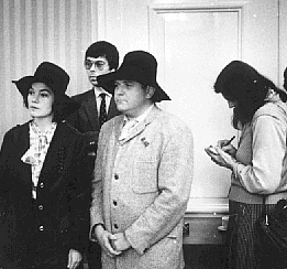 Minister Rina Olôf-Kreehé en consul Matyss Rames Zjae-Ûtefusot worden toegesproken door de koningin tijdens een receptie in het Fordo-paleis ter gelegenheid van de installatie van een Commissie die het toerisme moet gaan bevorderen (29 oktober 1982). Op de achtergrond de privésecretaris van de koningin, Moffain Tja Henna-Bâljess. | ||